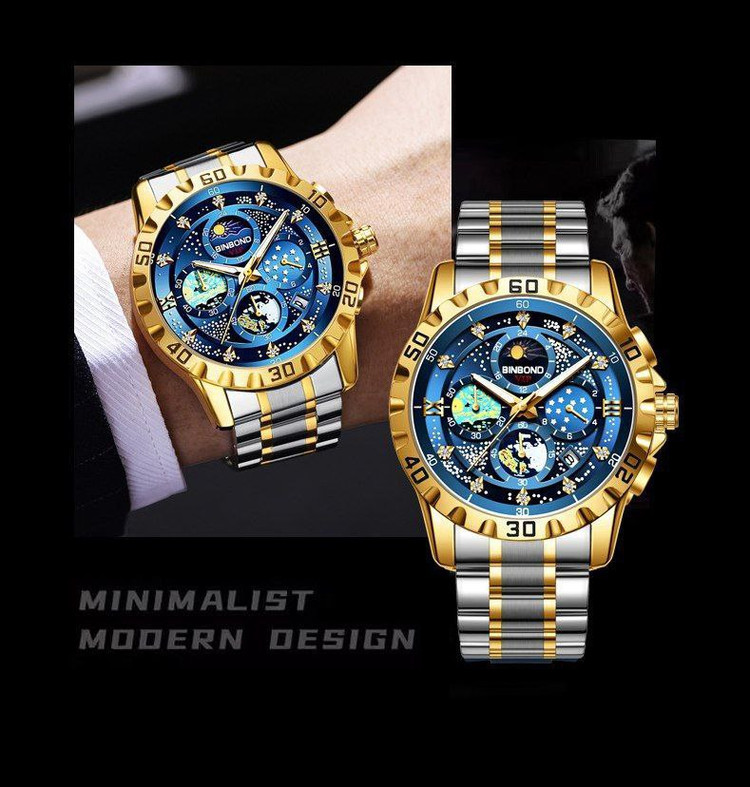 ساعت مردانه ، بین باند الماسی نو اصل چین ، نمایش روز ماه ، صفحه کهکشانی، برند شرکتی ، دارای روزشمار ، کرنوگراف، بند فولادی ضد زنگ ، ضد آب ، رنگ ثابت ، قفل کلیپسی، موتور کوارتز شرکتی