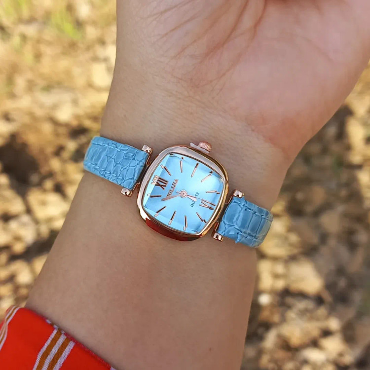 ساعت زنانه ، رنگ آبی آسمانی، بک استیل، بند چرم دور دوخت ، باطری قابل تعویض، مناسب مچ های ظریف و دخترونه