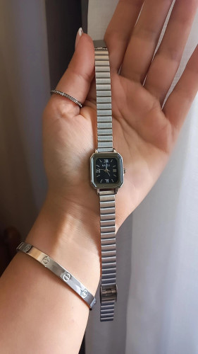 ساعت زنانه بین باند مدلی نو، جنس بند فولاد ضدزنگ، سبک غیررسمی، ضخامت ۱۰ میل، قطر صفحه ۲۳ میل، شیشه معدنی الماس ضدخش، قفل دستبندی، موتور کوارتز۱٬۶۸۵٬۰۰۰ تومان