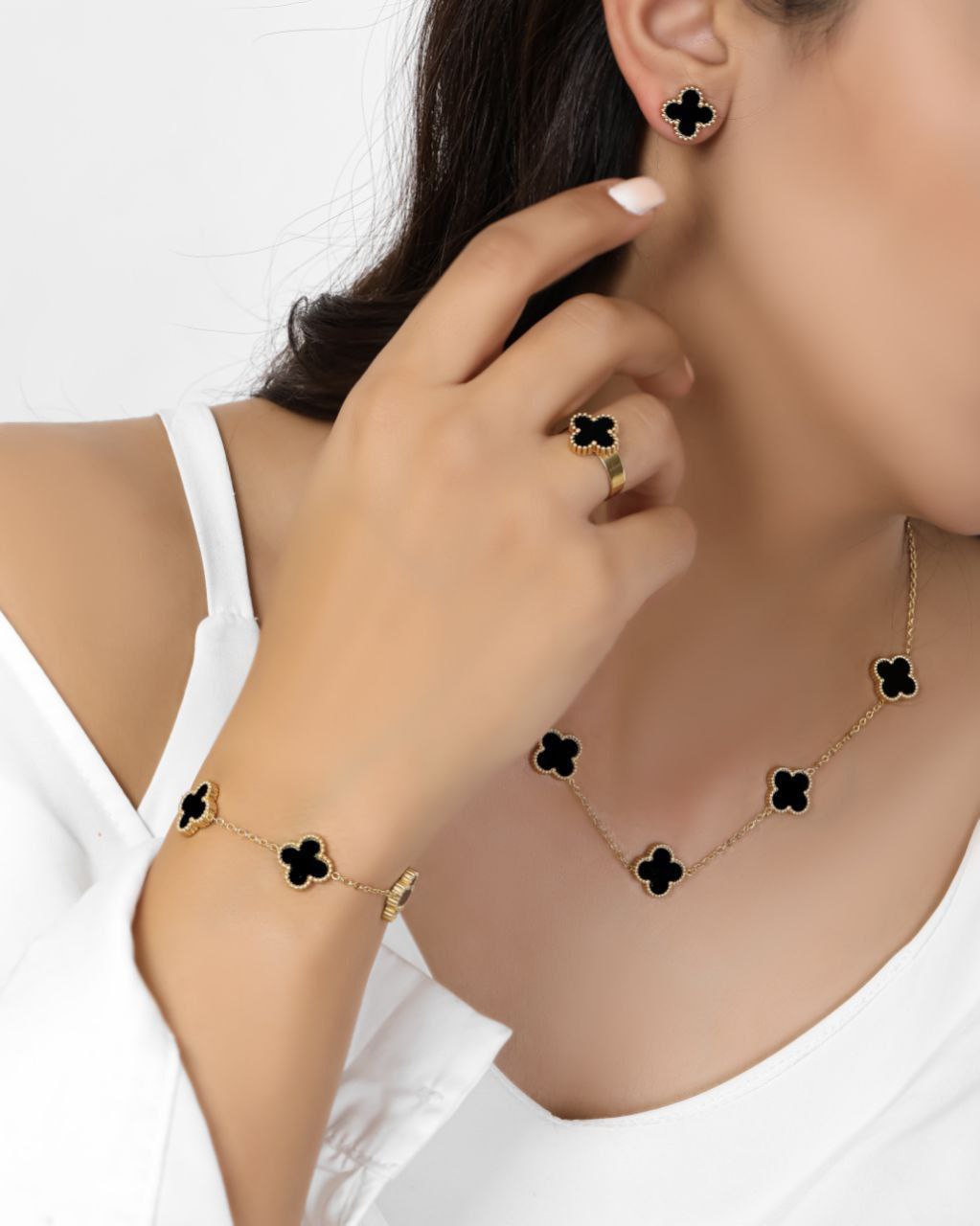 نیمست طرح طلا ونکلیف رنگ مشکی طلایی طول زنجیر ۴۵ سانت گوشواره میخی